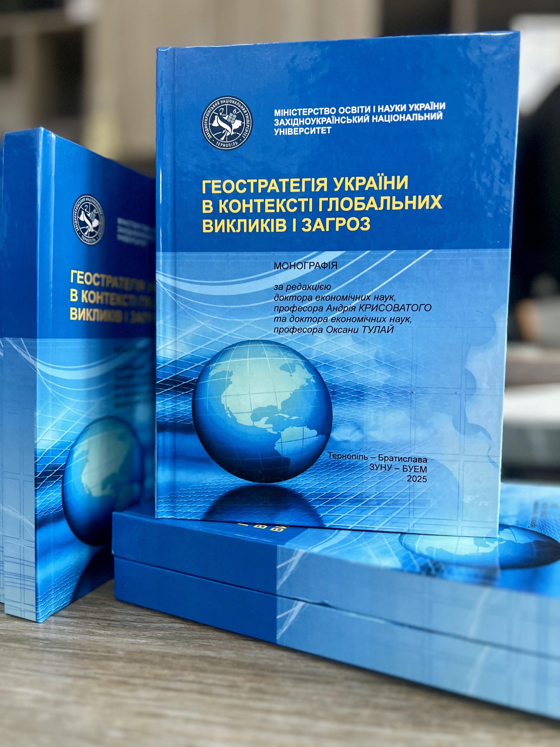 Отримали друковану версію монографії “Геостратегія України в контексті глобальних викликів і загроз” за редакцією А. І. Крисоватого, О. І. Тулай. Монографія присвячена аналізу сучасних викликів та трансформації у геостратегічному соціально-економічному та правовому середовищі в умовах глобалізації, військових конфліктів та нестабільності. Видання об’єднує дослідження провідних науковців із різних галузей знань, які вивчають вплив глобальних змін на Україну та інші країни. Авторський колектив зосередив увагу на ідейно-теоретичних засадах геостратегічних трансформацій. Предметною сферою аналізу є детермінанти геопросторових змін, зокрема досвід охорони здоров’я під час пандемії COVID-19, соціально-економічні фактори ризикової поведінки молоді, а також соціальна напруга у суспільстві. Розглянуто соціальні, економіко-правові й фінансові виклики, з якими зіштовхнулася Україна в умовах війни. Висвітлено геостратегічні пріоритети України в контексті сталого розвитку. Проаналізовано фінанси сталого економічного відновлення. Монографія є цінним ресурсом для науковців, викладачів, студентів, політиків та фахівців зацікавлених у сучасних тенденціях розвитку суспільства й економіки в умовах глобальних викликів і загроз.